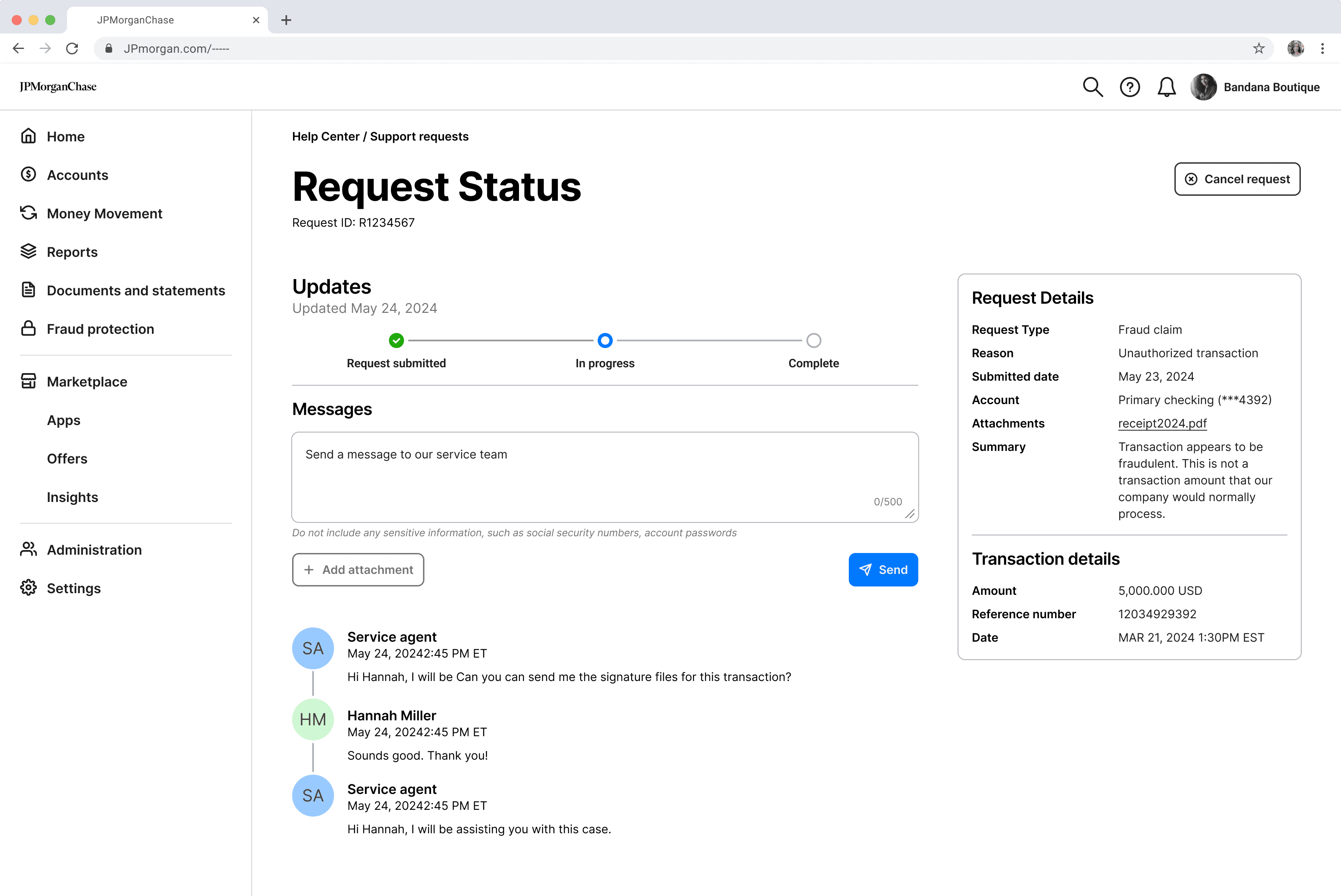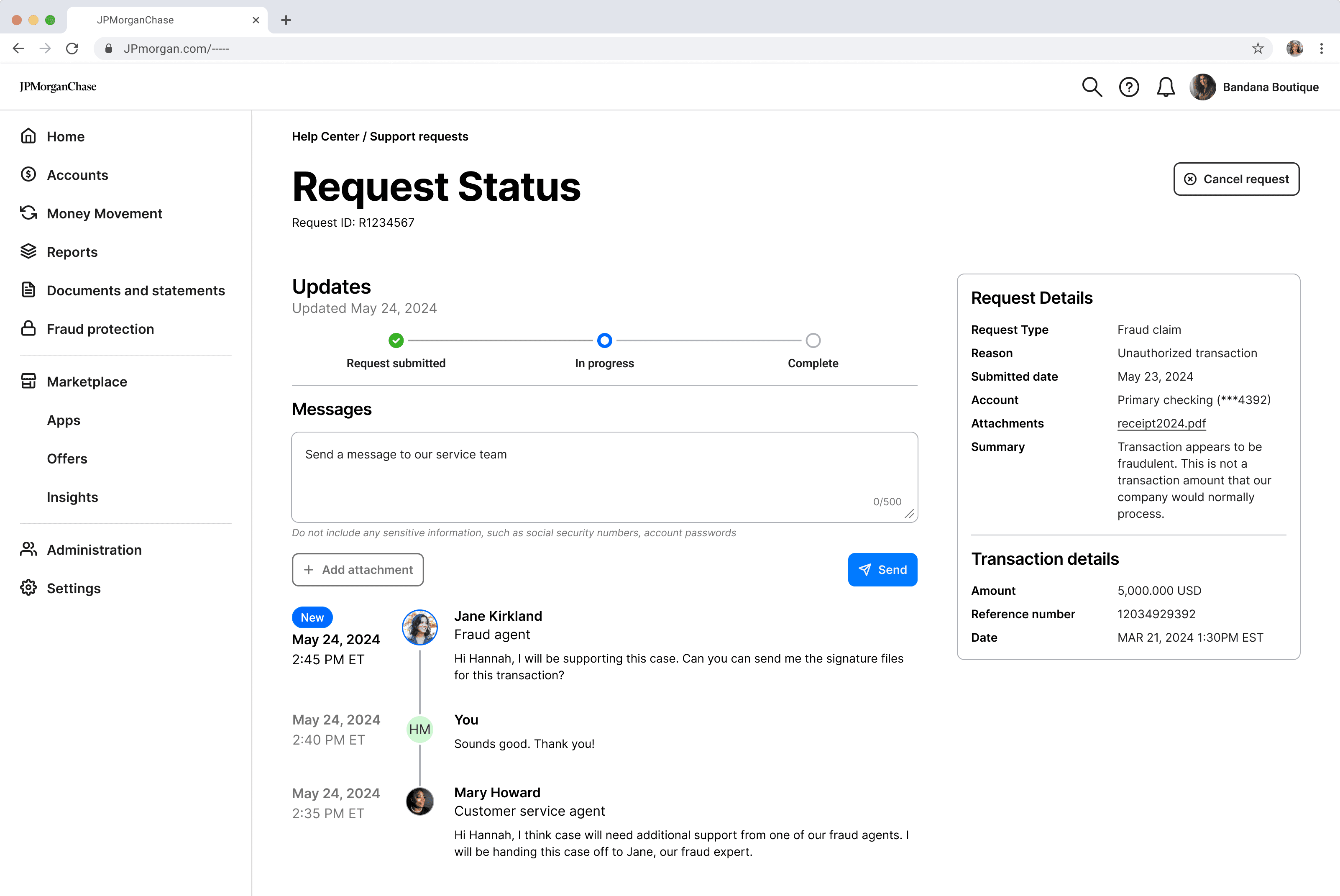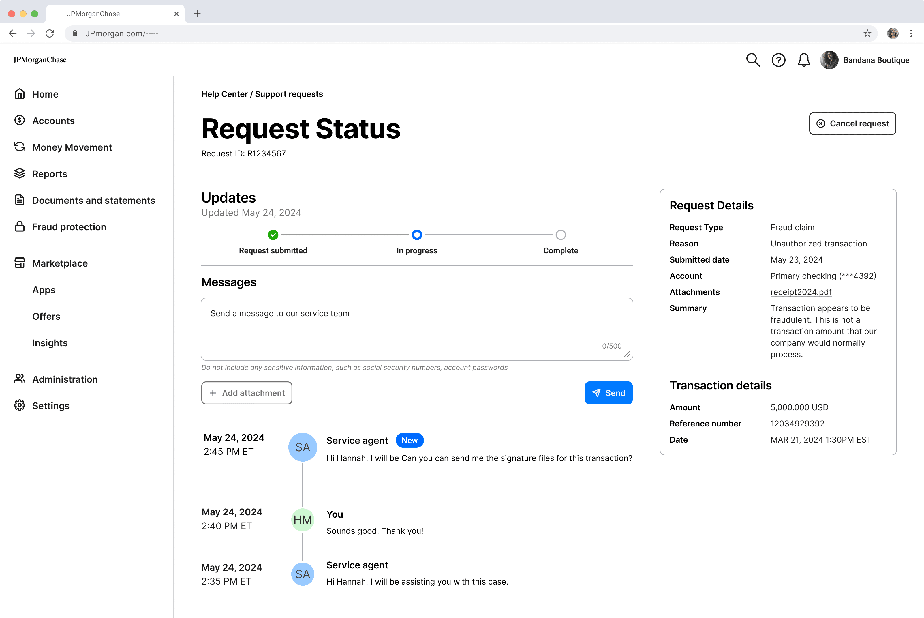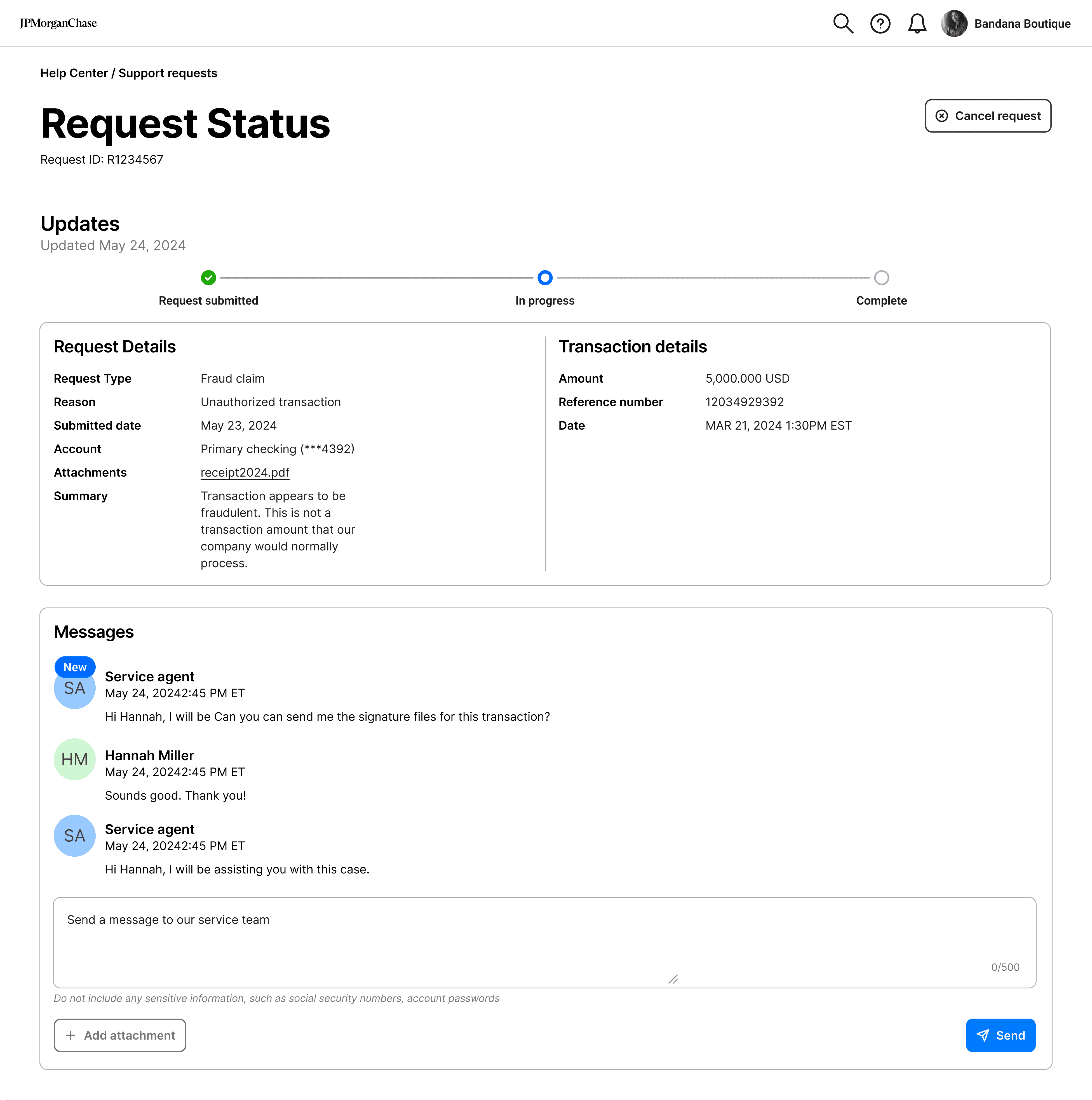 The request status page highlights key case details, emphasizing real-time tracking and easy access to agent communication to accelerate resolution.