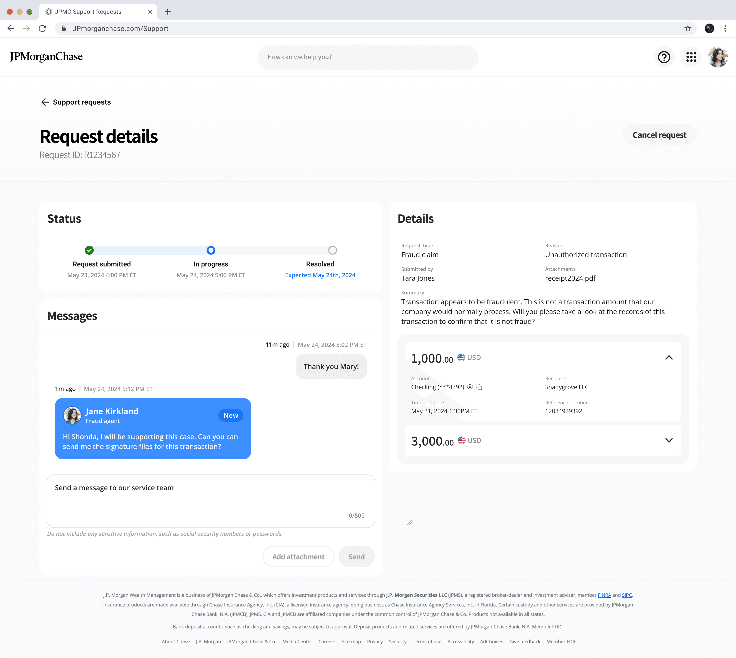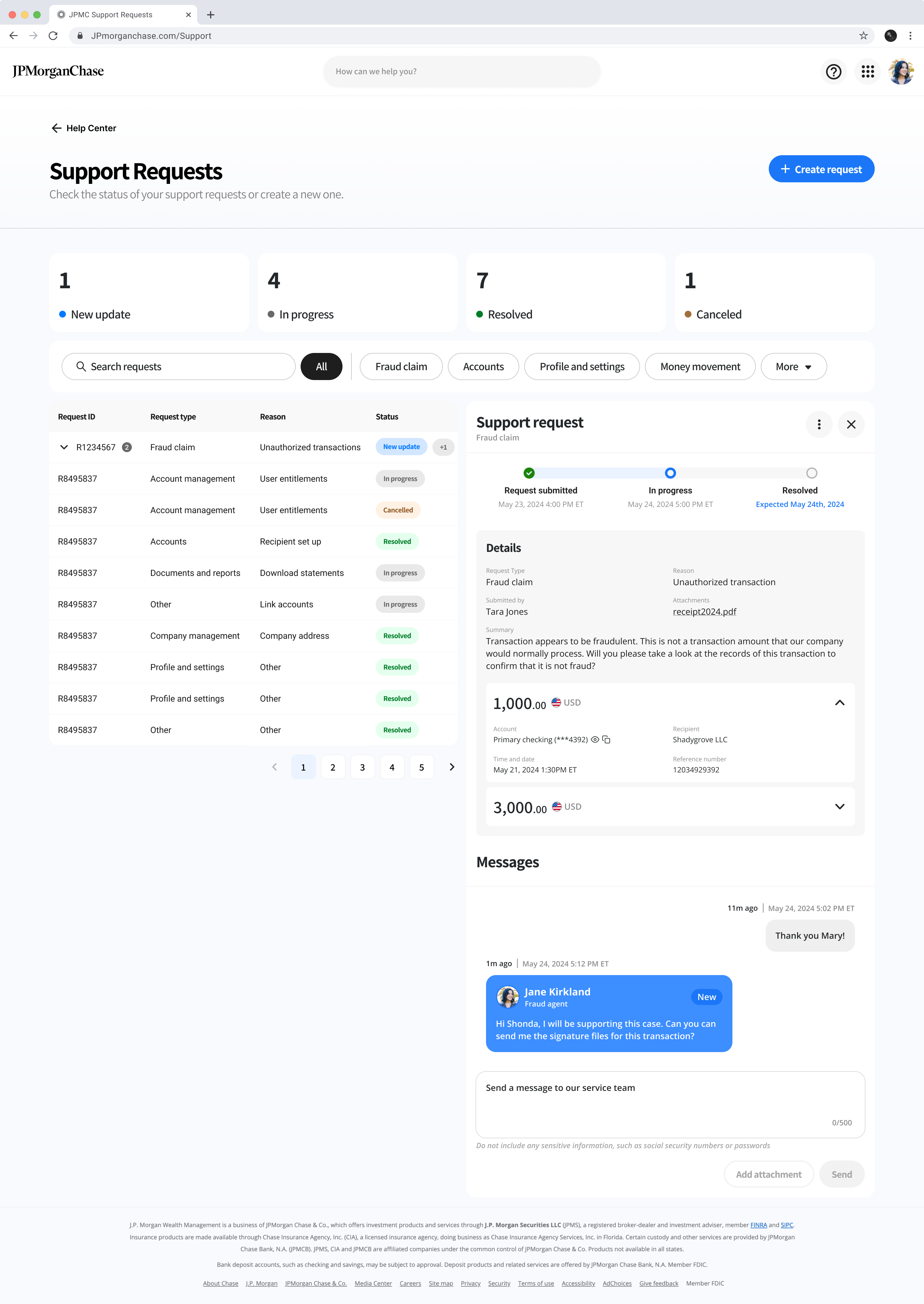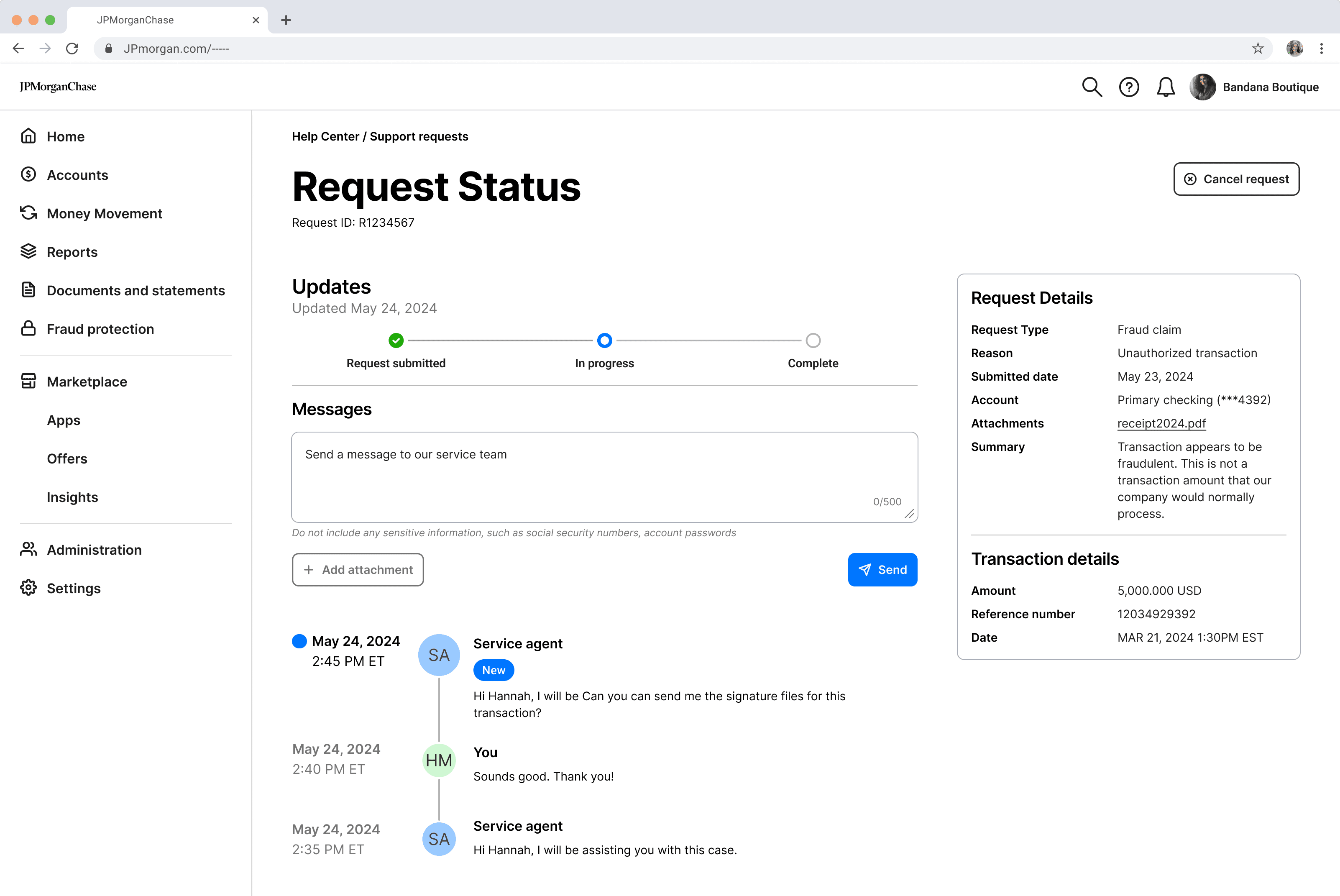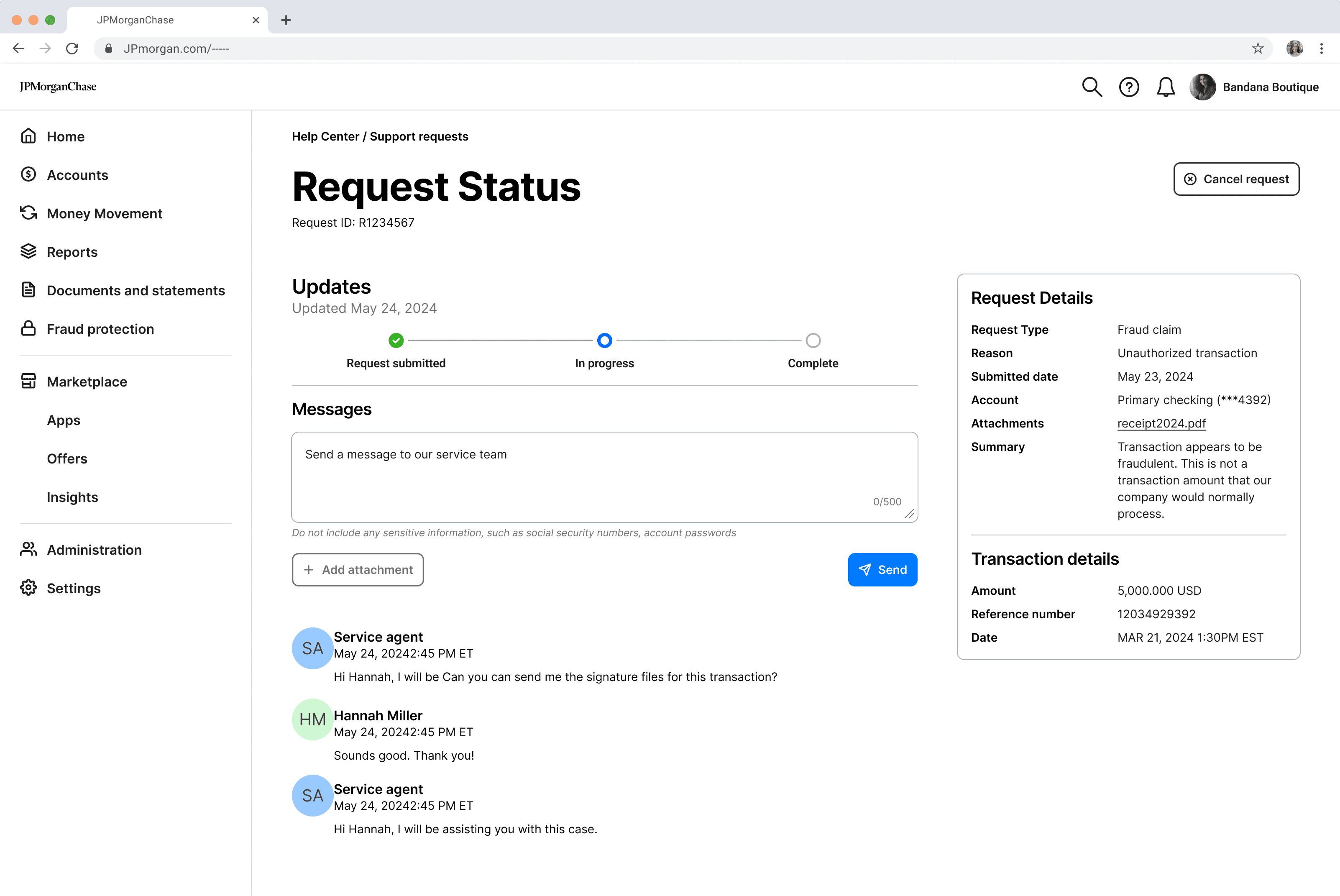 The request status page highlights key case details, emphasizing real-time tracking and easy access to agent communication to accelerate resolution.